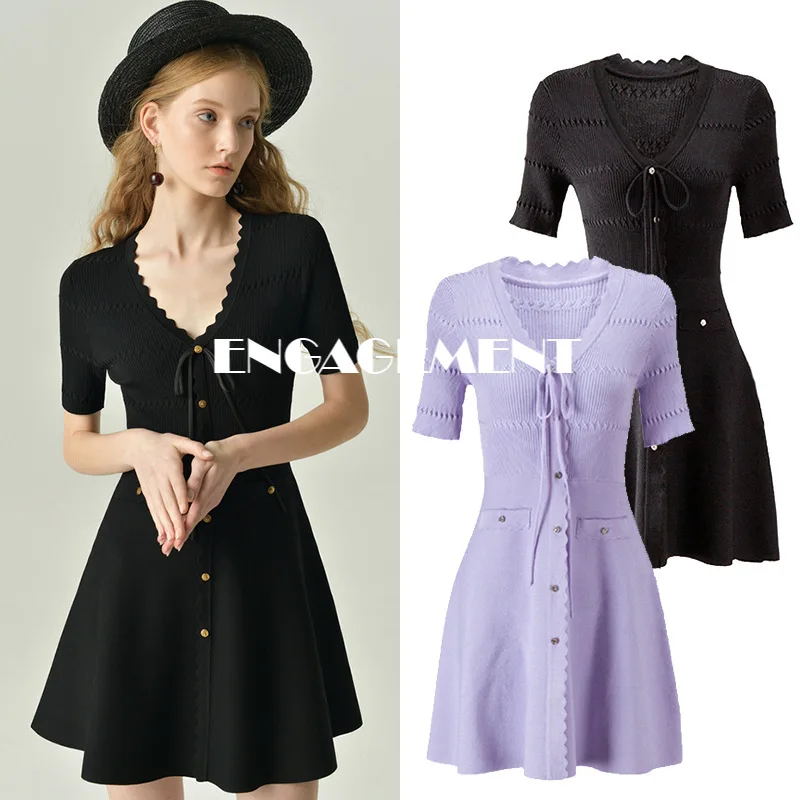 Costomer Scores and Reviews for ENGAGEMENT 2021 Summer New Single-breasted Knit Dress Female Wavy V-neck Bow Skirt